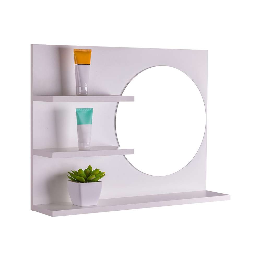 A espelheira possui 3 prateleiras externas para guardar e organizar os itens de higiene pessoal e acessórios do seu banheiro, além de acompanhar um espelho redondo amplo proporcionando um uso prático e agradável.