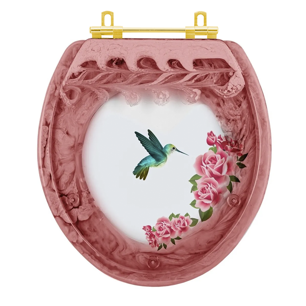 Assento Sanitário Poliester Decorada Convencional Rosa Quartzo Beija Flor Com Ferragem Dourada