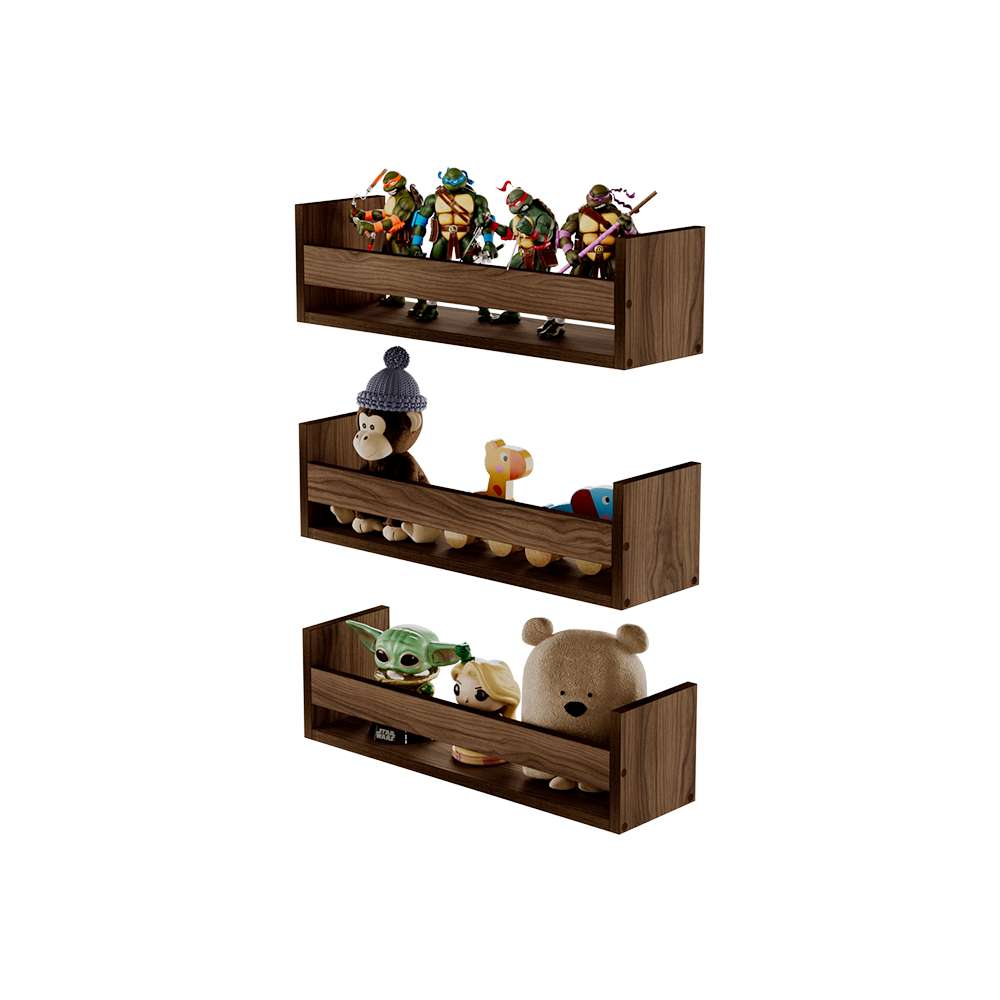 Kit 3 Prateleiras Porta Brinquedos Nogal 60 x 12cm Suporte Invisivel