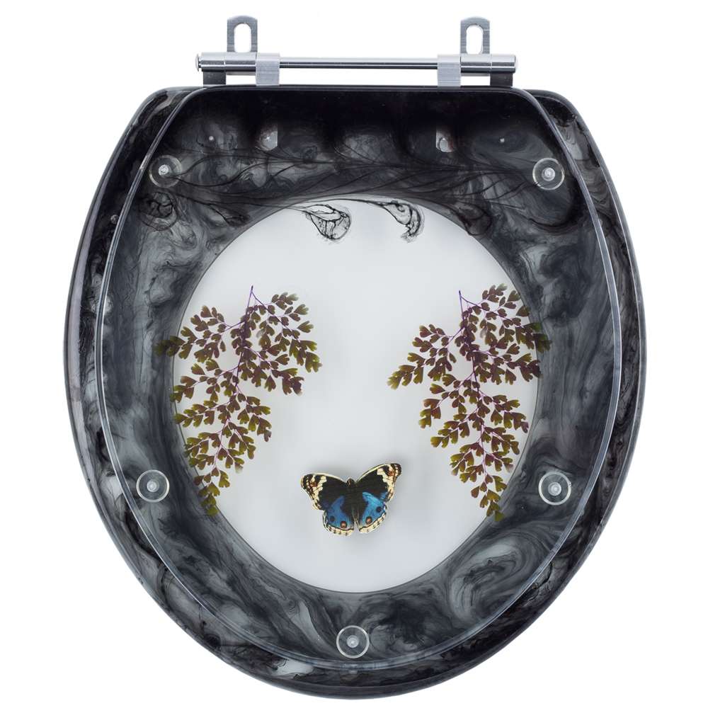 O Tampa de Vaso Convencional Oval Preto Decorado com Borboleta Azul Escuro é a opção ideal para quem busca combinar funcionalidade com elegância em seu banheiro.